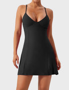This one-piece tennis skort features high-quality nylon with a four-way stretch for a snug, second-skin fit and built-in shorts for comfort. The stylish spaghetti strap V-neck enhances your shape, making it perfect for tennis, cycling, and running.