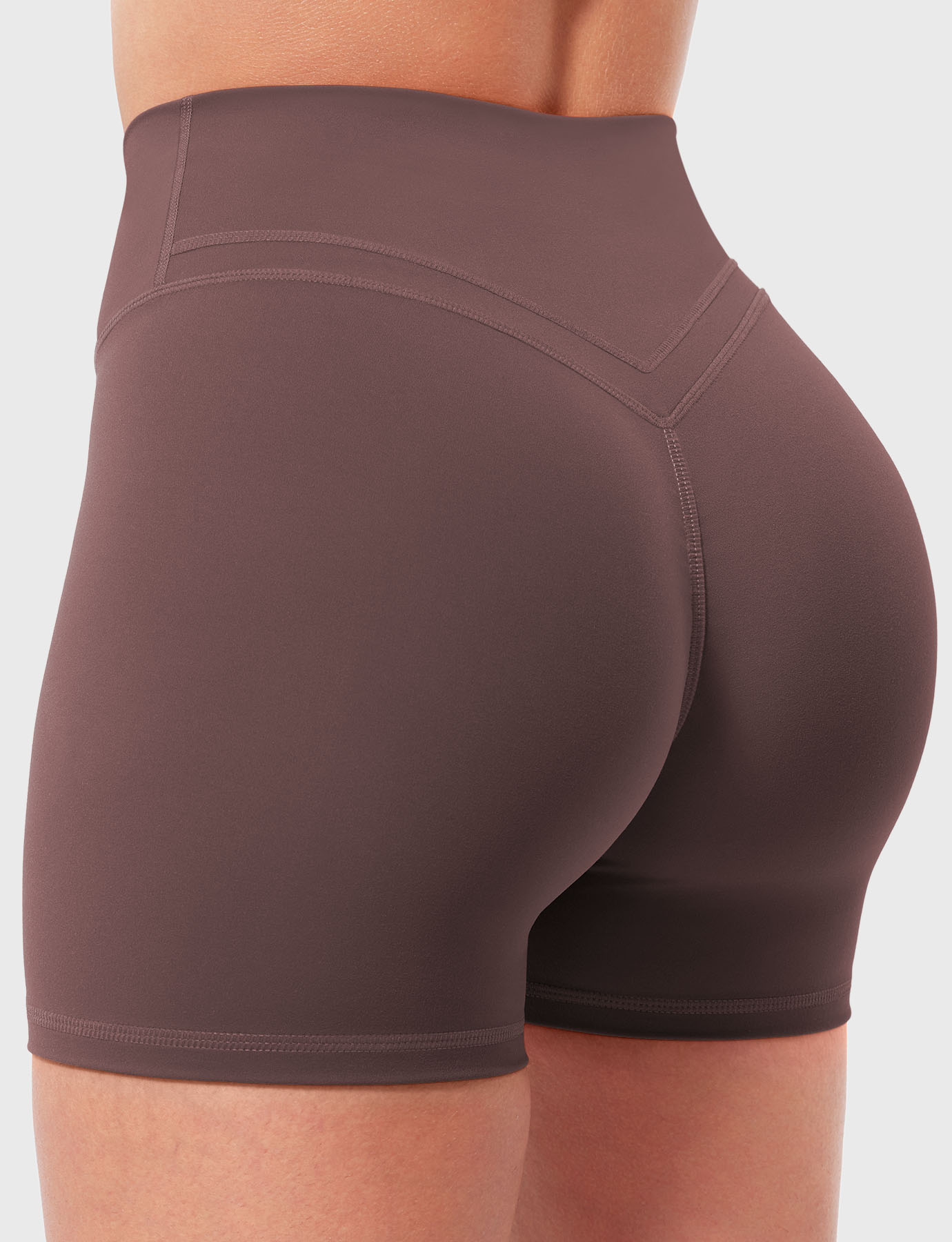 Side Back view of Yeoreo Almiy High Waisted Workout Shorts in Coffee – V-stitch waistband and glute-lifting contour